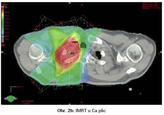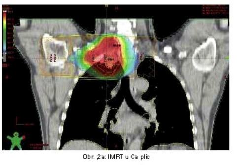 Významným zlepšením přesnosti ozáření se stala radioterapie s modulovanou intenzitou (IMRT). IMRT rozkládá svazek záření na jednotlivé paprsky s proměnlivou intenzitou. Výsledkem je programové kolísání fluence záření napříč ozařovacím polem a zpřesnění ozáření i velmi nepravidelných cílových objemů. IMRT může zlepšit pokrytí cílového objemu a redukovat dávku na plíce (obr. 2a,b). Indikací jsou zejména nádory v těsné blízkosti jícnu a míchy (6,7).