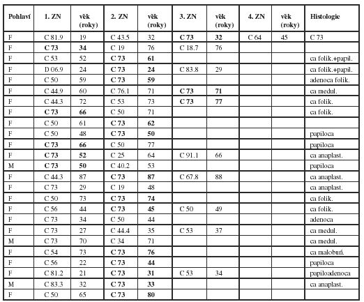 • ZN thyreoidey, primární (44%) a následné (56%) se vyskytly v poměru 1 : 1,3.