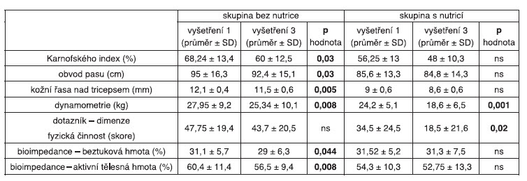 Pacienti na nutriční podpoře dosahovali během opakovaného sledování hodnot srovnatelných se vstupními daty při prvním vyšetření v paliativní ambulanci v oblasti týkající se hodnocení jejich stavu Karnofského indexem, z antropometrických hodnot pak obvodem pasu a kožní řasy nad tricepsem oproti skupině bez nutriční podpory. Bioimpedencí byly nalezeny také stálejší hodnoty aktivní tělesné hmoty oproti ve skupině bez nutrice, kdy byly nalezeny signifikantně klesající hodnoty aktivní tělesné hmoty i dalších parametrů nutričního stavu.