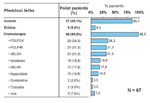 Do zpracování bylo celkem zařazeno 67 pacientů s vyplněným záznamem. Z toho bylo 31 mužů a 36 žen, věk při zahájení léčby panitumumabem 52-73 let (medián 63 roků). Onkogen K-ras byl vyšetřen u 65 pacientů, z toho u 63 šlo o „divoký typ" (96,9 %). Exprese EGFR byla stanovena u 50 pacientů (pozitivní u 63,1 %), u 15 nebyl EGFR stanoven nebo uveden. Predominantním ložiskem metastáz byla játra (73,1 %), dále plíce (32,8 %), lymfatické uzliny (32,8 %) a peritoneum (20,9 %). Adjuvantní léčba byla provedena u 29 pacientů (43,3 %), u 22 z nich (75,9 %) režimem FUFA. Panitumumab byl podáván ve 2. linii u 28 pacientů (42,8 %), ve 3. linii u 34 (50,7 %), ve 4. a vyšších liniích léčby u 5 (7,5 %). Nejčastěji použitou sekvencí bylo podání panitumumabu ve 2. linii po předchozím selhání kombinace bevacizumab + chemoterapie (u 27 pac.). Bevacizumab byl podáván u 57 nemocných (85,1 %), v kombinaci s chemoterapií u 56 (83,6 %). Chemoterapii (různé režimy, různé linie) obdrželi všichni pacienti. Přehled předchozí léčby před podáním panitumumabu ukazuje obr. č. 1.