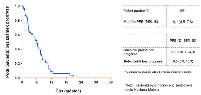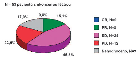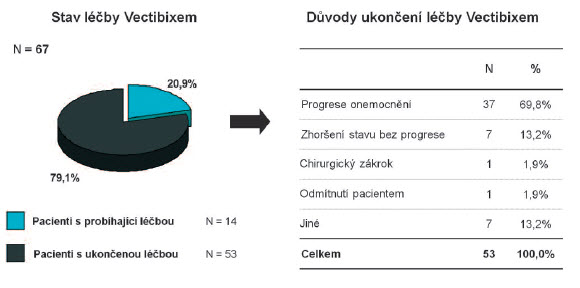 Medián trvání léčby panitumumabem byl 4.2 měsíce (0.2-20.3 měs.) Žádný z léčených nedosáhl kompletní remise, u 15,1% bylo dosaženo parciální remise a u 45,3% stabilizace onemocnění (podrobně viz obr. č.3)