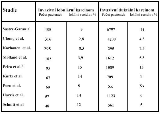 V minulosti proběhly 2 typy studií srovnávající lokální recidivu a přežití u pacientek po prs zachovávajícím operačním výkonu. U jednoho typu byla srovnávána lokální recidiva u ILC a invazivního duktálního karcinomu. U druhého typu studie byly konfrontovány výsledky mezi ablací prsu a parciální mastektomií.Výsledkem bylo mírné zvýšení výskytu lokální recidivy po 5 leté observaci u ILC ve většine studií (více viz tabulka).
