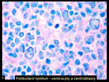 Cytologicky je nádor typicky smíšený (obr. 1) a je tvořen centrocyty a centroblasty („centrocyticko-centroblastický lymfom“ Kielské klasifikace). Centrocyty jsou středně velké lymfocyty s rozštěpeným jádrem, nenápadnými nukleoly a amfofilní cytoplazmou. Centroblasty jsou větší lymfocyty s nerozštěpeným jádrem a nápadnějšími jadérky při membráně, cytoplazma je bazofilní. Příměs nenádorových malých T-lymfocytů, folikulárních dendritických buněk (FDC) s jemným chromatinem bez nukleolů a nezřetelnou cytoplazmou a makrofágů je obvyklá. Histologická struktura je nodulární resp. folikulární (nad 75%), folikulární a difúzní anebo minimálně folikulární (do 25%). Diagnostické obtíže mohou způsobovat různé morfologické varianty (florální varianta, marginální diferenciace, depozice eozinofilního materiálu, sklerotizace apod.). Plazmocytoidní diferenciace event. s tvorbou paraproteinu je možná, ale v porovnání s ostatními B-lymfomy vzácná15.