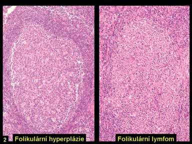 FL je kromě jiných B-lymfomů nutné odlišit od folikulární hyperplazie (obr. 2), která má folikuly polarizované, plášťové struktury jsou obvykle kompletně zachované, jednotlivé často velmi nepravidelné a různě velké folikuly jsou od sebe odděleny parakortexem, v centrech jsou četné mitotické figury a makrofágy s Flemmingovými tělísky.
