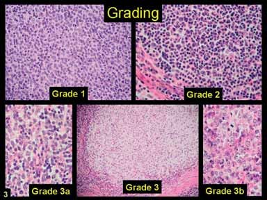 - grade 3b je nodulárně uspořádán, ale tvořen je takřka výlučně centroblasty. Morfologicky splývá s folikulár ním centroblastickým lymfomem Kielské klasifikace.