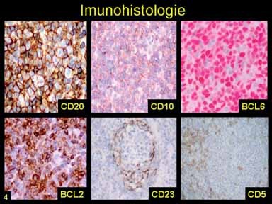 Imunofenotyp. V základním imunohistologickém vyšetření (obr. 4) nádor exprimuje znaky řady B - CD20, CD79a, CD19 a BSAP/PAX5. Centrofolikulární původ nádoru potvrzuje pozitivita CD10 a BCL6.
