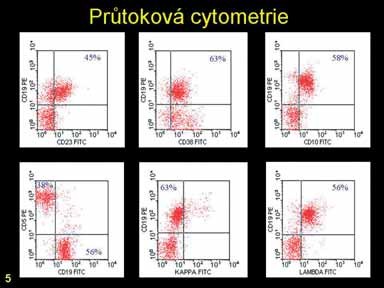 Cytoplazmatická pozitivita BCL2 v centrofolikulárních buňkách je pravidlem a odlišuje nádor od reaktivního procesu. Může být pozitivní CD23, která současně znázorňuje sítě FDC v různém rozsahu destruované nádorovým růstem. Negativní je CD5 a cyklin D1. V průtokové cytometrii (obr. 5) se prokazuje imunofenotyp CD19+, CD20+, CD10+, CD38+, CD21+, CD22+, FMC7+, CD79a+, CD79b+, sIg+; variabilní je exprese CD23 a CD43; negativní jsou znaky CD5, CD11c, CD25 a CD103. Průtoková cytometrie umožňuje odlišit low-grade FL od jiných CD10+ lymfomů (high-grade FL, DLBCL a Burkittův lymfom) zejména podle exprese CD71 či proliferačního indexu12,16. Rozlišení podle velikosti buněk (forward scatter) je méně spolehlivé.