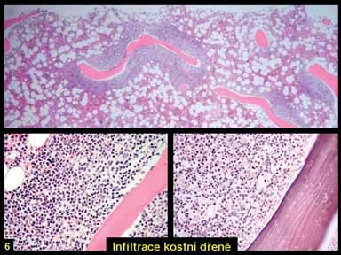 Postižení kostní dřeně u FL se v době diagnózy prokazuje asi ve 45% případů. Pro folikulární lymfom je typické paratrabekulární postižení (obr. 6), často až „rukávovité“, spojené s retikulární fibrotizací a hyperplastickou reakcí okolní hematopoezy. Jiné typy infiltrace jsou méně časté. Lymfom je ve dřeni většinou zastoupen menšími až středně velkými centrocyty s méně výraznou příměsí větších centroblastů, a to i v případech, že v uzlině byl diagnostikován folikulární lymfom grade 3 (viz dále) - hovoří se o tzv. diskordantním obrazu. Grade lymfomu při vyšetření kostní dřeně proto nelze spolehlivě stanovit.