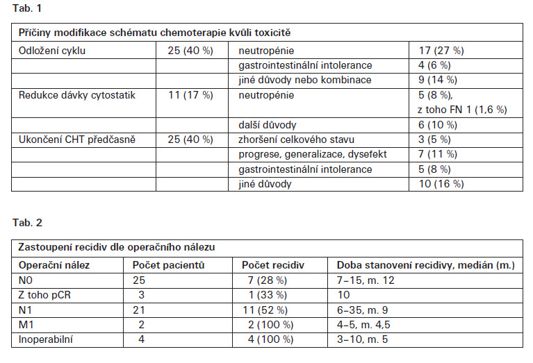 Tolerance této chemoterapie byla dobrá, předoperační 3 cykly dokončilo 63 (94 %) nemocných, 3 ukončili po 1. cyklu pro zhoršení celkového stavu, u 1 pacientky po 1. cyklu došlo ke změně na chemoradioterapii a dále byla léčena na jiném pracovišti. Nejčastějšími nežádoucími účinky byla leukopenie, únava a celková slabost a projevy gastrointestinální intolerance. Leukopenie byla zaznamenána u 34 (54 %) pacientů, z toho vážnějšího stupně 3-4 u 6 (10 %), v 1 případě došlo k rozvoji febrilní neutropénie. Únavu a celkovou slabost uvedlo 37 (59 %) pacientů, z toho ve 3 případech se jednalo o těžší formy únavy nebo slabosti. Gastrointestinální intolerance byla vyjádřena nevolnostmi, zvracením, průjmy nebo zácpou. Nevolnosti a zvracení mělo 36 (57 %) pacientů, z nich u 5 (8 %) se jednalo o obtíže stupně 3-4. Průjmy udalo 15 (24 %) pacientů, u 2 (3 %) se jednalo o průjmy stupně 3-4. Zácpou trpělo 13 (21 %) pacientů, u všech v dobře zvládnutelné formě. Méně často došlo k vyjádření dalších projevů intolerance: anémie - 15 (24 %) pacientů, hubnutí - 12 (19 %) pacientů, stomatitida - 7 (11 %) pacientů, neurotoxicita - 7 (11 %), nefrotoxicita - 5 (8 %) pacientů, psychická dekompenzace - 4 (7 %) pacienti, trombocytopénie - 3 (5 %) pacienti, hand-foot syndrom - 2 pacienti (3 %). O závažný stupeň se jednalo jen u 1 pacienta s projevy neurotoxicity, v ostatních případech se jednalo o projevy střední závažnosti. Příčiny nutnosti modifikace schématu chemoterapie kvůli projevům toxicity shrnuje tab. 1. Tolerance pooperační léčby je obecně horší, s častější gastrointestinální toxicitou (zvracení, průjmy), z 52 pacientů indikovaných k operaci 39 pacientů (75 %) pokračovalo poté adjuvantní chemoterapií, 6 (15 %) z nich nedokončilo pro intoleranci.