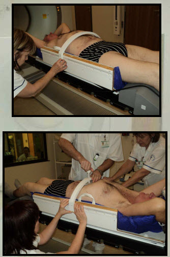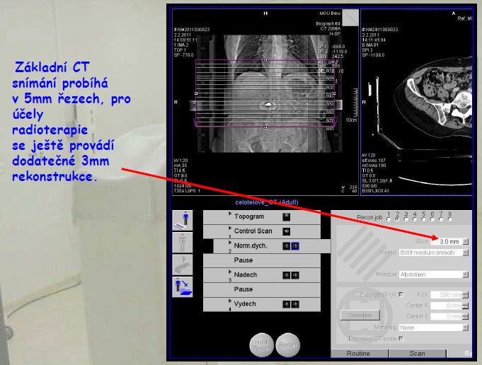 Naskenujeme topogram a zkonzultujeme s lékařem radioterapie přesnou oblast pro CT. Horní a spodní hranici snímání určí lékař radioterapie. Šířka oblasti snímání by měla být maximální, jelikož pro toto vyšetření je nutné mít zachycené i okraje koryta v němž je pacient s fixačním vakem uložen