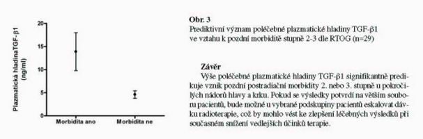 Pozdní morbidita 2. nebo 3. stupně byla zaznamenána u 16 pacientů. Výše poléčebné plazmatické hladiny TGF-β1 signifikantně predikovala vznik pozdní morbidity 2. nebo 3. stupně (morbidita ano versus ne, medián 16,4 versus 6,9, p=0,05, viz Obr.3).