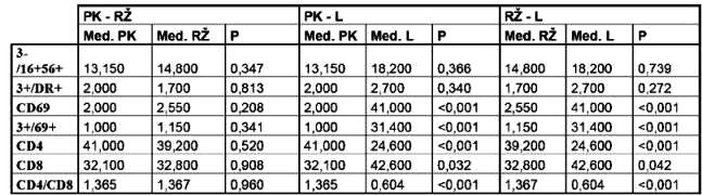 Výsledky měření jsou uvedeny v tabulce. Statisticky významné rozdíly byly zjištěny ve výskytu těchto subsetů v nádoru oproti nálezu v periferní krvi a renální žíle: CD3+/69+, CD4+, CD8+, poměr CD4+/CD8+, CD69+. Aktivační molekula CD69+, zprostředkovávající časné aktivační signály, byla vyjádřena na vyšším procentu mononukleárních buněk izolovaných z nádorové tkáně. CD8+ T lymfocyty byly dominantní lymfocytární populací v nádorové tkáni, naopak CD4+ T lymfocyty byly většinovou populací v periferní a renální žilní krvi. Zastoupení NK buněk (CD3–/16+56+) a CD3+/DR+ T lymfocytů nevykazovalo statisticky významné rozdíly.