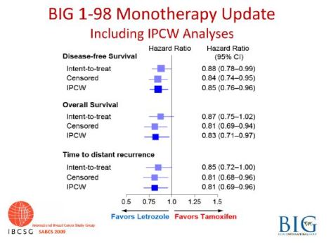 - IPCW analýza ukazuje signifikantní výhodu podávání letrozolu proti tamoxifenu, která je větší něž v ITT populaci