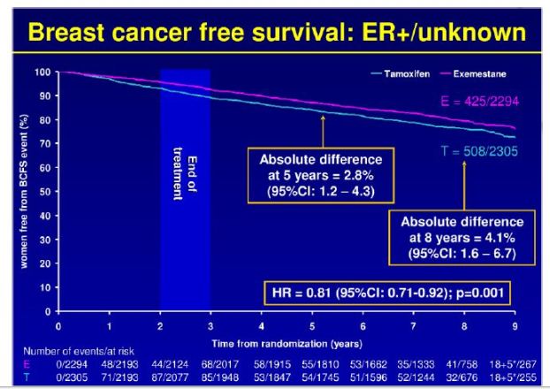 - 754 (~15%) pacientek na tamoxifenu změnilo léčbu (před 2,5 rokem) na exemestan, což mohlo ovlivnit výsledky