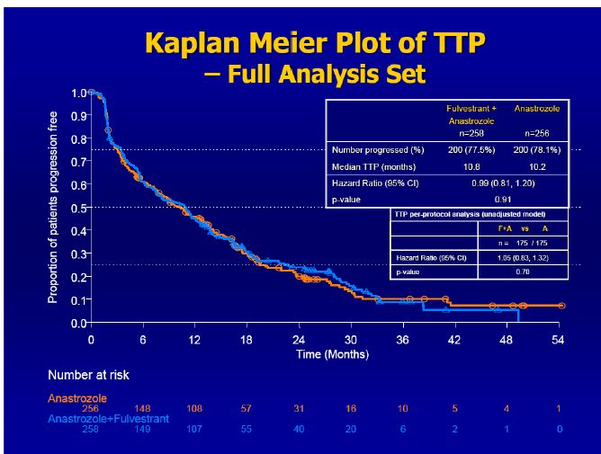 - Medián TTP – 5,5 měsíce vs. 4,1 měsíce (fulvestrant vs.anastrozol)