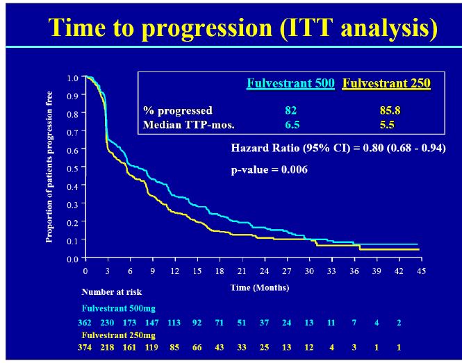 - Fulvestrant 500mg podávaný po selhání předchozí endokrinní léčby pokročilého ca prsu prodloužil dobu do progrese o 20% proti 250mg fulvestrantu