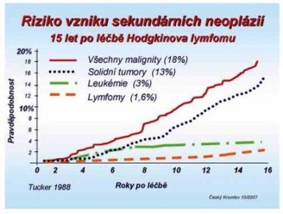 Graf. č. 2. Sekundární neoplázie: zvýšený výskyt hematologických malignit, především akutních myeloidních leukémií u pacientů, léčených primárně chemoterapií (za 2 - 10 let), zvýšené riziko solidních tumorů po radioterapii (později), po 15 letech jejich výskyt stále stoupá.