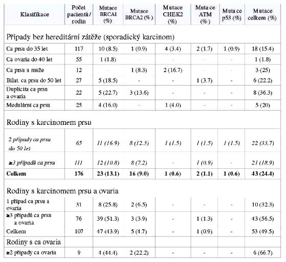 karcinomem prsu nebo ovaria, znázorňuje tabulka 1. Je ukázán výskyt