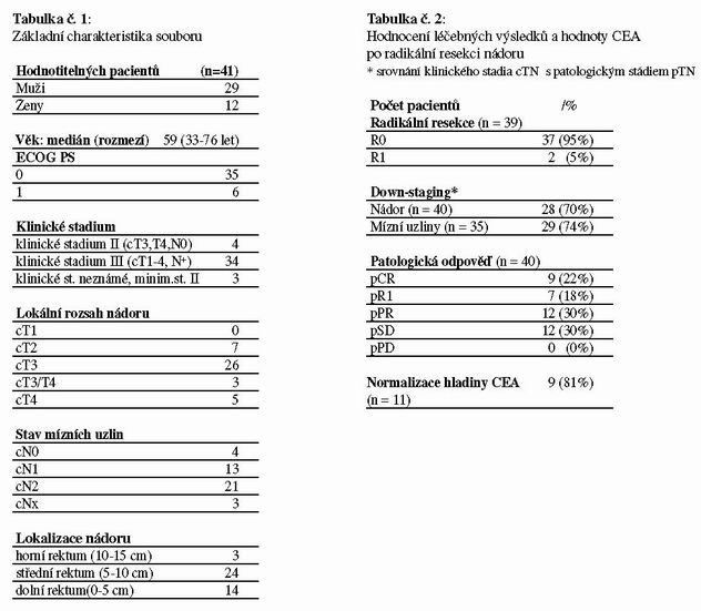 K 31. 1. 2004 byla léčebná odpověď a toxicita hodnocena u 41 pacientů: 29 mužů, 12 žen, medián věku činil 59 let. K danému datu byl medián sledování 16 měsíců. Úmrtí nebylo dosud zaznamenáno u žádného z nemocných. V 83 % se jednalo o karcinomy rekta klinického stádia III, dle TRUS s detekcí patologických regionálních mízních uzlin. Z histologických podtypů adenokarcinomu převažovaly tubulární karcinomy. Vzdálenost od anodermální linie měřená rigidním rektoskopem byla následující: dolní rektum (0-5 cm) u 14 pacientů, střední rektum (5-10 cm) u 24 pacientů, horní rektum (>10 cm) u 3 pacientů, tabulka č. 1. Původně plánovaná dávka kapecitabinu byla podána 34 pacientům (83%), u 7 pacientů byl režim zkrácený o 1 týden z důvodu myelotoxicity. Zkrácení radioterapie o týden bylo nutné u 2 pacientů (5%). Příčinou byla závažnější radiační dermatitida nebo průjem. Kumulativní toxicita 3. stupně byla zaznamenána u 15% pacientů, pouze u jednoho pacienta byla zaznamenána hematologická a slizniční toxicita 4. stupně. Chirurgický zákrok byl prováděn za 4-6 týdnů po ukončení neoadjuvantní chemoradioterapie. Tato doba vycházela z literárních údajů, když odezní akutní toxicita po ozáření a ještě se neprojeví chronické změny normálních tkání po ozáření. Současně se projeví maximální regrese nádoru. Radikální resekce nádorového rezidua byla provedena u 40 pacientů, amputace rekta u 16 (39%) pacientů a resekce tumoru se zachováním anu u 25 (61%) pacientů. Patologická kompletní remise byla verifikována u 9 (22%) pacientů. Mikroskopické reziduum v nádorovém resekátu bylo zjištěno u 7 pacientů (17%), celkem bylo dosaženo u 16 pacientů (39%) kompletní nebo téměř kompletní remise onemocnění. Při srovnání výchozí o klinického stadia cT s následným patologickým stádiem pT byla zaznamenána regrese u 28 ze 40 operovaných pacientů, tedy v 70%. Srovnání regionálních lymfatických uzlin bylo možné u 35 pacientů, downstaging byl zaznamenán u 29 pacientů (74%). K normalizaci iniciálně zvýšené hodnoty CEA došlo po skončení konkomitantní léčby u 9 z 11 pacientů (81%), tabulka č.2. U všech pacientů s vyjádřenou symptomatologií onemocnění došlo v průběhu léčby kvymizení nebo alespoň výraznému zmírnění těchto projevů.