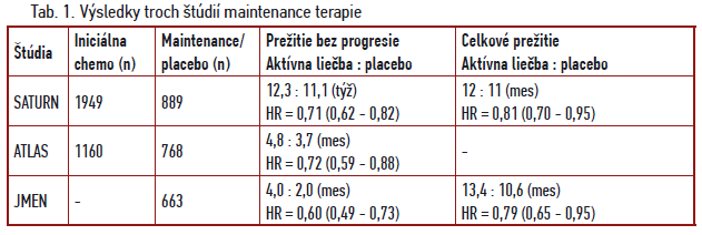 Počas roku 2009 boli publikované výsledky troch kľúčových štúdií, zameraných na význam maintenance terapie, resp. udržiavacej liečby pri pokročilom – metastatickom NSCLC. Po docielení odpovede alebo stabilizácii ochorenia po 4 cykloch štandardnej chemoterapie SATURN porovnal erlotinib oproti placebu, ATLAS (po chemoterapii s bevacizumabom) maintenance bevacizumab + erlotinib verzus bevacizumab + placebo, JMEN pemetrexed oproti placebu. Základné výsledky sú v Tab.1 (1, 2, 3).