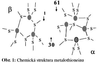 (MT) je datován rokem 1957, kdy Margoshes a Valee izolovali MT z koňských ledvin [5]. Metalothionein patří do skupiny intracelulárních, nízkomolekulárních na cystein velmi bohatých proteinů (obsah Cys až 30 % v molekule proteinu) o molekulové hmotnosti 6-10 kDa [3,6]. MT se skládají ze dvou vazebných domén á, â které jsou složeny z cysteinových klastrů (Obr.1).
