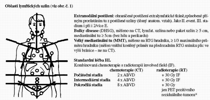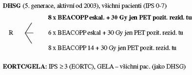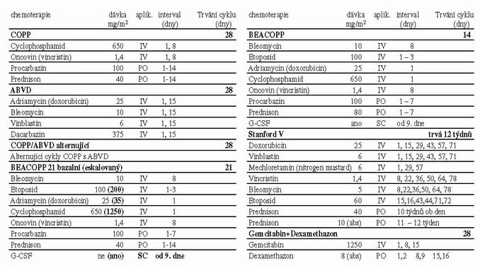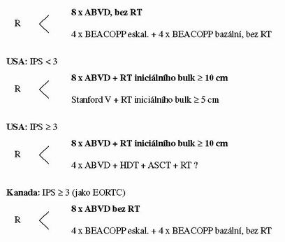 6–8 x ABVD + 30 Gy jen PET pozit. rezid. tumoru nebo 4 x (COPP + ABVD) + 30 Gy jen PET pozit. rezid. tu. U pacientů, kde vzhledem ke komorbiditě je nutno již primárně použít paliativní terapii je indikovaná především radioterapie: EF (extended field) RT u nodálního postižení (CS IIB, III) a u stadia IV 6 – 8 x COPP + 30 Gy jen PET pozit. rezid. tu.