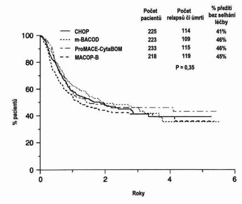 To, že je možné pacienty s DLBCL a s jinými agresívními lymfomy vyléčit kombinovanou chemoterapií s antracykliny, bylo známo již před zveřejněním studie definující Mezinárodní prognostický index. Shodou okolností rovněž v roce 1993 byla zveřejněna studie zkoumající, zda nové chemoterapeutické režimy 2. a 3. generace poskytují pacientům s agresívními lymfomy (opět nešlo pouze o DLBCL) lepší naději na vyléčení než standardní chemoterapie CHOP (3). Jak je dobře známo, výsledky této studie znamenaly pro mnohé zklamání, protože takzvané „intenzifikované“ režimy (ProMACE-CytaBOM, MACOP-B, m-BACOD) s sebou přinesly pouze vyšší toxicitu, ale nikoli lepší výsledky. Nicméně i tato studie byla nesmírně důležitá jednak v tom, že definovala jako léčebný standard jednoduchý a relativně nejméně toxický režim CHOP, jednak opět proto, že ukázala, co můžeme od této tehdy standardní léčby očekávat (kompletní remise cca u 60-70% pacientů s pokročilým onemocněním a dlouhodobé přežití bez progrese u cca 40-45% z nich - Obrázek 2).