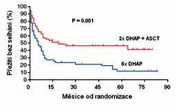 Jako další možnost zlepšení léčebných výsledků u nově diagnostikovaných rizikových pacientů s DLBCL byla zkoumána možnost užití vysokodávkované chemoterapie s autologní transplantací jako konzolidační terapie. Tento koncept získal teoretickou podporu po roce 1995, kdy byly zveřejněny výsledky tzv. PARMA studie (7), které ukázaly, že u relabovaných či primárně rezistentních agresívních lymfomů, které jsou chemosenzitivní na léčbu druhé linie, vede autologní transplantace ke zlepšení přežití bez selhání terapie (Obrázek 4) i ke zlepšení celkového přežití oproti konvenční léčbě. Randomizované studie zkoumající tuto strategii strategie jako součásti léčby první linie však přinesly přinejlepším rozporuplné výsledky, v některých případech dokonce pacienti léčení ve standardních ramenech dosahovali lepších výsledků než pacienti v ramenech transplantačních. Dvě recentně publikované metaanalýzy (8, 9) neprokázaly výhodu autologní transplantace v první kompletní remisi, a to ani u rizikových pacientů. Obě tyto práce se ovšem potýkaly s extrémní heterogenitou publikovaných prací, která znesnadňuje jejich přímé srovnání. V řadě studií byli pacienti zařazení do ramene s ASCT léčeni zkrácenou indukční terapií, jinde dokonce byla dávková intenzita indukční léčby nižší v „intenzifikovaném“ rameni než v rameni „standardním“ (10). V řadě studií značná část pacientů zařazená do transplantační větve nakonec transplantována nebyla. Strehlova metaanalýza (8) naznačila, že autologní transplantace jako součást léčby první linie by mohla být prospěšná u pacientů se středně vysokým či vysokým rizikem dle IPI, kteří dostanou nezkrácenou standardní léčbu před autologní transplantací a je u nich dosaženo optimální cytoredukce. Eventuální další studie mohou dále prokázat efekt transplantace za předpokladu, že budou zahrnovat především mladší pacienty (věkový medián <40 let), z nichž alespoň 50% bude mít masívní nádor (>10 centimetrů v průměru) a pokud alespoň 75% pacientů zařazených do transplantačního ramene bude skutečně transplantováno.
