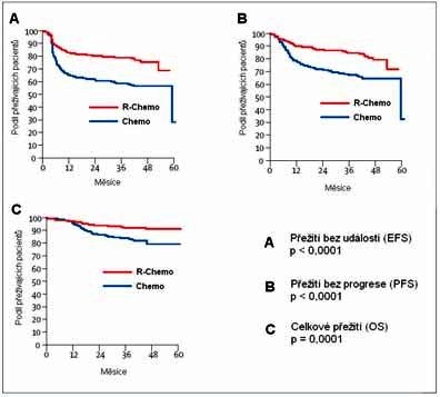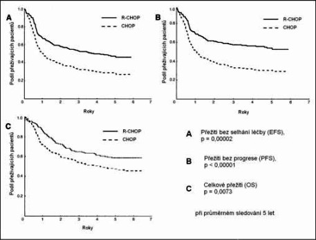 Francouzská studie GELA LNH 98-5 byla prvně publikována v roce 2002 a doplněna delším sledováním v roce 2005 (12, 13). Přidání Rituximabu k režimu CHOP zvýšilo počet kompletních remisí o 12% (75% v. 63%), pětileté přežití bez progrese (PFS) téměř o dvojnásobek (54% v. 30%), a celkové pětileté přežití o 13% (58% v. 65%). Důležité je, že tyto výsledky jsou stabilní i po delší době sledování a nůžky mezi rameny s Rituximabem a bez něho se spíše nadále rozvírají (Obrázek 5). Americká studie ECOG 4494/CALGB 9793 dosáhla obdobných výsledků, i když design studie byl komplikován zařazením „udržovací“ terapie Rituximabem, což poněkud znesnadňuje interpretaci výsledků (14). Platnost uvedených výsledků pro starší věkové skupiny pacientů byla potvrzena i studií RICOVER, která užívala 14denní CHOP a kromě randomizace do ramene s rituximabem či bez něho randomizovala ještě mezi 6 a 8 cyklů chemoterapie. Konečná analýza této studie dosud nebyla zveřejněna, ale opět byly potvrzeny lepší výsledky větví s rituximabem a navíc bylo prokázáno, že 6 cyklů chemoterapie je stejně účinných jako 8 cyklů.