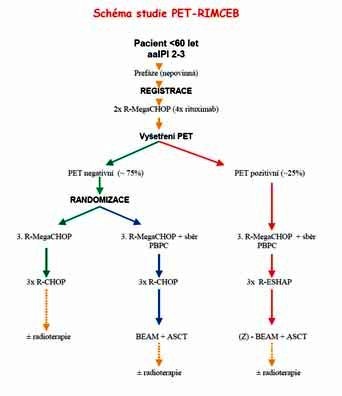 Zavedení pozitronové emisní tomografie (PET) ukazuje, že pacienti, kteří dosáhnou PET negativity po dvou či čtyřech cyklech terapie, mají výrazně lepší naději na vyléčení, než pacienti, kteří PET negativity nedosáhnou (18). Tento koncept dosud nebyl studován v prospektivní studii, respektive taková studie dosud nebyla publikována. Právě taková studie je však v současné době připravována Kooperativní lymfomovou skupinou (PET-RIMCEB). Druhou otázkou, na kterou by měla tato studie odpovědět, je význam autologní transplantace u rizikových pacientů v 1. kompletní remisi. Pacienti v této studii budou léčeni dvěma cykly chemoterapie R-MegaCHOP, se čtyřmi dávkami rituximabu. Po provedení PET vyšetření budou PET negativní pacienti randomizováni do větve netransplantační (léčba 3. cyklem R-MegaCHOP a následně 3 cykly R-CHOP) nebo do větve transplantační (3. cyklus R-MegaCHOP, 3x R-CHOP a vysokodávkovaná terapie s ASCT). Pacienti, kteří budou po 2. R-MegaCHOP PET pozitivní, budou pokračovat v původním protokolu R-MegaCHOP-ESHAP-BEAM. Schéma studie je uvedeno přehledně na Obrázku 10. Vzhledem k tomu, že dle předběžných zkušeností je pouze zhruba 25% pacientů po 2-3 cyklech R-MegaCHOP PET pozitivních, mohla by tato strategie v budoucnu vést ke snížení léčebné zátěže u výrazného počtu mladších rizikových pacientů s DLBCL.