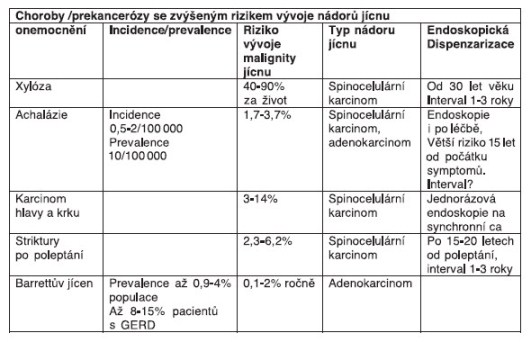 Nejvýznamnější prekancerózou jícnu je tzv. Barrettův jícen. Vzniká v důsledku dlouhotrvajícího gastroezofageálního refluxu. Pacienti s BJ by měli být pravidelně endoskopicky dispenzarizováni. Nezbytnou součástí léčby je účinná antirefluxní terapie. V případě průkazu těžkého stupně dysplazie nebo časného adenokarcinomu je indikována intervence – endoskopická resekce nebo ablace, případně resekce jícnu.