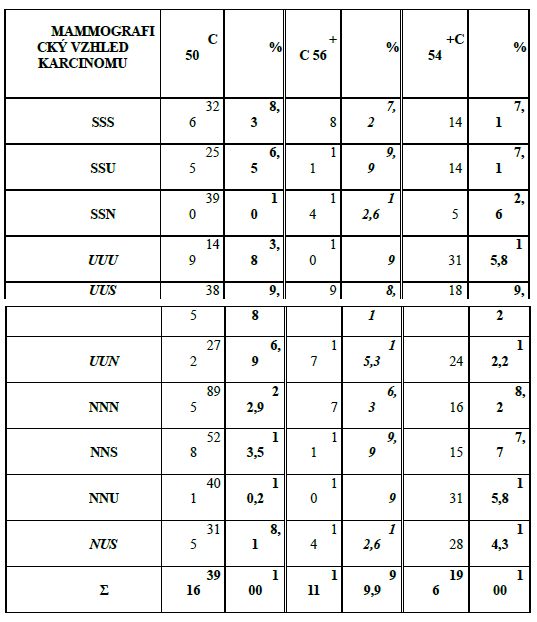 SSS = mammograficky karcinom v celém obvodu cípatý, SSU = mammograficky karcinom z větší části cípatých kontur a částečně ohraničený, SSN= mammograficky karcinom z větší části cípatých kontur a částečně neohraničený, UUU = mammograficky karcinom ohraničený, UUS = mammograficky karcinom z větší části ohraničený a částečně cípatých kontur, UUN= mammograficky karcinom z větší části ohraničený a částečně neohraničený, NNN = mammograficky karcinom neohraničený, NNS = mammograficky karcinom převážně neohraničený a částečně cípatých kontur, NNU = mammograficky karcinom převážně neohraničený a částečně ohraničený, NUS = mammograficky karcinom ohraničeně neohraničeně cípatých kontur.