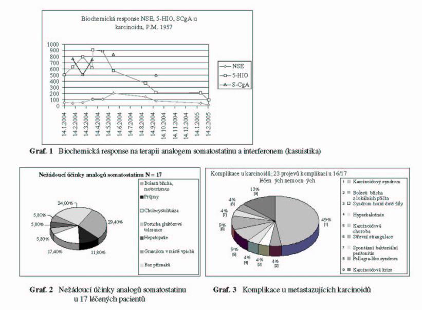 Při paliativní léčbě pokročilých forem maligních karcinoidů analogy somatostatinu a interferonu, řeší terapeut mj. jednak problém správného hodnocení response na léčbu a jednak komplikace onemocnění. Tato evaluace je vodítkem k další korekci medikace. Dalším problémem jsou komplikace vzniklé během léčby. Ty jsou vyvolány možnými vedlejšími účinky analogů a interferonu. V naprosté většině případů je lze korigovat a nejsou důvodem k přerušení léčby. Závažnějšími se jeví komplikace vzniklé přirozeným vývojem onemocnění. Je uveden přehled a vlastní zkušenosti na souboru 39 nemocných dispenzarizovaných nemocných, zejména 17 pacientů léčených analogy a interferonem v průběhu let 1997 – 2005 na IV. Interní klinice VFN v Praze.
