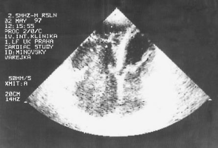 Obr 1 Echokardiografický nález těžké trikuspidální insuficience s dilatací pravé síně a dilatací a hypertrofií pravé komory u karcinoidové srdeční nemoci
