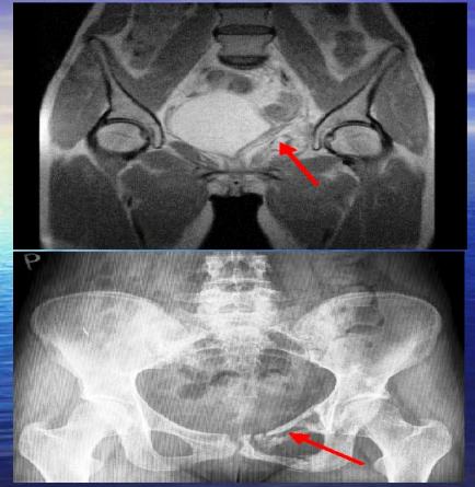 - realizována pouze biopsie tumoru - Histologie:- sex cord stromaltumor, vs tumor z buněk granulosy-možný původ z ektopickeho ovaria (pozn-ektopické ovarium se peroperačě nenašlo) –metastatické postižení os pubis vlevo