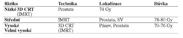 Lokalizovaný karcinom prostaty (CaP) může být léčen s kurativním záměrem radikální prostatektomií (RAPE), zevní radioterapií, intersticiální brachyradioterapií nebo kombinací těchto metod. Pacienti přijatí na Kliniku radiační onkologie MOÚ jsou na základě vstupních vyšetření (T stadium, PSA, Gleason skóre) rozdělováni do tří skupin podle rizika rekurence: nízké, střední a vysoké (případně velmi vysoké) riziko rekurence. Dle rizika rekurence je zvolena velikost ozařovaného klinického cílového objemu (CTV), dávka záření a technika ozáření (tab. č. 1).