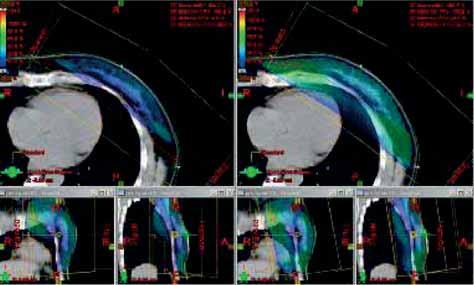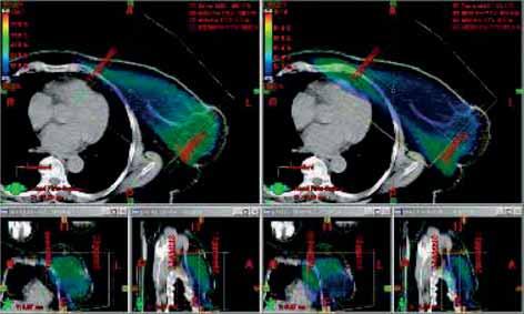 Optimalizací konvenční ozařovací techniky je snaha pokrýt plánovanou dávkou PTV a minimalizovat dávku v kritických orgánech tj. srdci, plíci, kontralaterálním prsu, horním jícnu, míše.