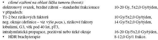 - oblast mammy 50 Gy (až 60 Gy) a cíleně oblast reziduálního tumoru 20-24 Gy (event. po dávce 20 Gy další zmenšení velikosti pole), do celkové dávky 60-70 (74) Gy.