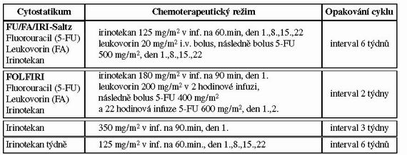 Cílem naší práce je retrospektivní analýza souboru nemocných s metastatickým KRK léčených kombinací raltitrexed (Tomudex) a oxaliplatina (Eloxatin). Tato salvage chemoterapie byla podávaná pacientům při ztrátě citlivosti na 5-fluorouracil a irinotekan, při progresi onemocnění v průběhu léčby nebo při opakovaném relapsu. Přehled režimů používaných v 1. linii léčby ukazuje tabulka č.1. Irinotekan v monoterapii byl indikován za předpokladu, že došlo k relapsu onemocnění do 6 měsíců od skončené adjuvantní chemoterapie Mayo režimem, dále v případech intolerance 5-FU v adjuvantním podání (závažná toxicita při předpokládaném deficitu dihydropyrimidin dehydrogenázy, toxoalergická reakce, kardiotoxicita) a u pacientů s anamnézou závažného onemocnění srdce, arytmiemi nebo nestabilní anginou pectoris.