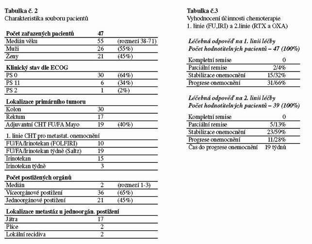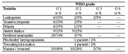 Bylo hodnoceno 47 pacientů, 26 mužů a 21 žen, medián věku 55 let. Celkově bylo podáno 209 cyklů chemoterapie, medián 6 (rozmezí 1-9). Podrobná charakteristika souboru je v tabulce č. 2. Terapeutická účinnost a toxicita režimu byla hodnocena ve sledovaném období u 39 pacientů. Parciální odpověď (PR) byla dokumentována u 5 pacientů (13%), stabilizace onemocnění u 23 pacientů (59%) a progrese u 11 pacientů (28%). Kompletní remise nebyla zaznamenána, medián času do progrese onemocnění byl 19 týdnů (tabulka č. 3). Z nejčastějších nežádoucích účinků se vyskytovala periferní neuropatie prvního a druhého stupně (G1,2: 81%), gastrointestinální toxicita G1,2: 75% a elevace transamináz G1,2: 46%. Toxicita třetího stupně se vyskytla u 5 pacientů (12%). Toxicitu čtvrtého stupně jsme v našem souboru nezaznamenali, tabulka č. 4. Všichni pacienti byli léčeni ambulantně.