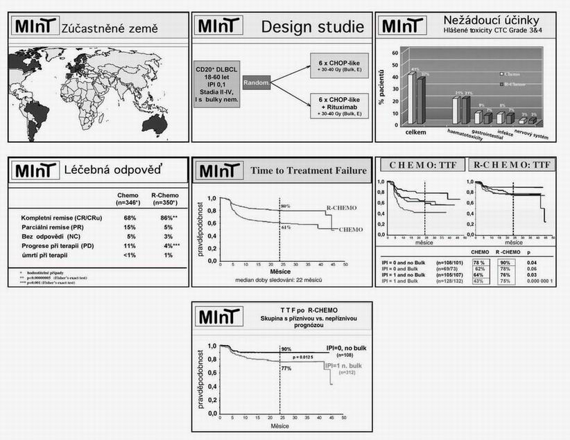 Multicentrická randomizovaná studie MInT byla zaměřena na srovnání standardní CHOP-like chemoterapie (CHEMO) se stejnou chemoterapií s přidáním rituximabu (R-CHEMO) u nemocných s DLBCL ve věku 18-60 let, klinického stádia II-IV, nebo I s bulky postižením, s rizikem dle IPI 0, 1. V případě „bulky“ nebo extranodálního onemocnění v době diagnózy byla naplánována a provedena radioterapie. Primárním cílem bylo zhodnocení času do selhání léčby (time to treatment failure, TTF) s událostmi definovanými jako nedosažení kompletní remise, progrese, relaps nebo úmrtí z jakékoliv příčiny.