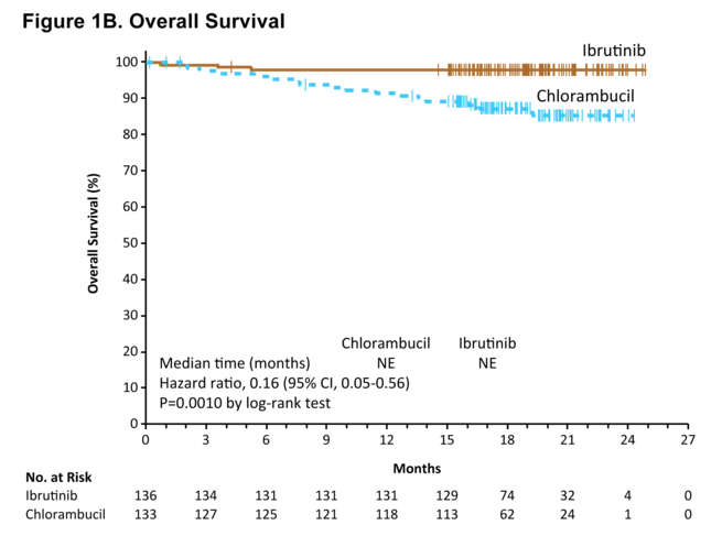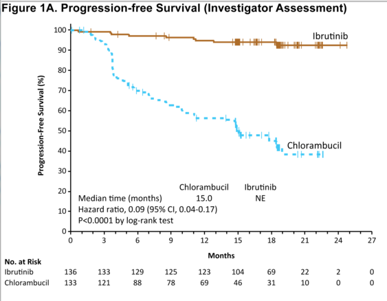 Methods: Pts aged ≥65 years with treatment-naïve CLL/SLL were randomized 1:1 to receive 420 mg ibr daily until progression or clb 0.5 mg/kg (up to maximum of 0.8 mg/kg) on days 1 and 15 of a 28-day cycle for up to 12 cycles. Pts with del17p were excluded. Primary endpoint was independent review committee (IRC)-assessed PFS periwCLL 2008 criteria, with 2012 clarification for treatment-related lymphocytosis. Secondary endpoints included overall survival (OS), ORR, event-free survival (EFS), rate of hematologic improvement, and safety. Pts with IRC-confirmed progression could transfer to an extension study where next-line therapy (including ibr) could be initiated if they had an iwCLL indication for treatment.