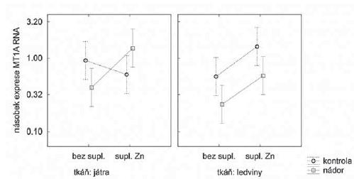 Velikost nádoru se v průběhu měsíce zvětšila 5násobně, aplikace ZnSO4 1,2násobně redukovala velikost nádoru (stat. nesig.). Rozdíly ve váze myší nebyly signifikantní. Po ukonční experimentu byla vyhodnocena exprese metalothioneinu 1A (MT1A). Hladinu MT1A signifikantně ovlivňuje aplikace ZnSO4 (p = 0,003) i přítomnost nádoru (p = 0,04), hladina MT1A je v organizmu s tumorovým procesem 1,6násobně nižší. Metabolizmus MT1A reaguje na přítomnost tumoru a aplikaci ZnSO4 odlišně v játerch a ledvinách (p = 0,05, obr. 1). Zatímco v jaterní tkáni způsobuje suplementace ZnSO4 pokles MT1A u kontrolní skupiny, u zvířat s nádorem způsobí suplementace jeho vzestup. Hladina MT proteinu se mezi těmito skupinami u jater a ledvin ovšem nemění.