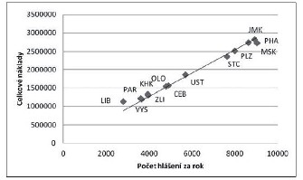 Graf 2. Přehled celkových nákladů na provoz pracovišť oproti počtu hlášení do NOR za 1 rok – agregováno po regionech