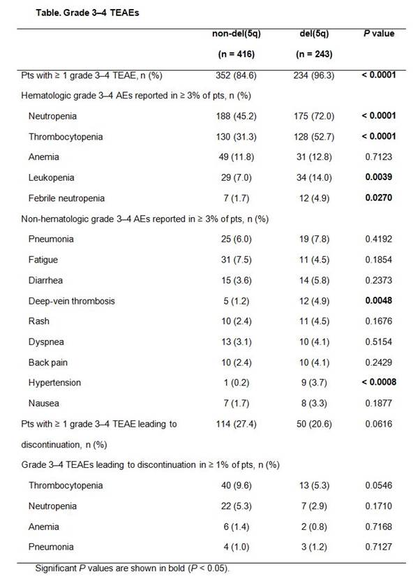 Methods: This retrospective analysis of pooled data from 7 prospective clinical trials compared the incidence of AEs in LEN-treated lower-risk MDS pts with or without del(5q). The non-del(5q) group included 416 pts from 4 studies: MDS-005 (n = 160), MDS-002 (n = 215), MDS-001 (n = 24), and PK-002 (n = 17). The del(5q) group included 243 pts from 5 studies: MDS-003 (n = 148), MDS-004 (n = 69), MDS-007 (n = 11), MDS-001 (n = 8), and PK-002 (n = 7). A TEAE was defined as an AE that began or worsened in severity on or after the first dose of LEN through to 28 days after the last dose of LEN. Pts received the recommended starting dose of 10 mg LEN for ≥ 1 cycle; in study MDS-005, pts with impaired creatinine clearance (CrCl; ≥ 40 to < 60 mL/min) had a LEN 5 mg starting dose in order to achieve a similar area under the curve as pts with normal CrCl who were receiving LEN 10 mg.
