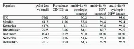 Dnes víme, že pro ženy je největším rizikem perzistence HPV HR infekce. V normálně sexuálně žijící populaci je vysoká prevalence HPV infekcí mezi 18 až 25 rokem (dle sérologie až 60 % žen se s infekcí „setkalo“), poté postupně klesá. Po 35 roce lze HPV pozitivitu nalézt u 3-5 % populace, která je vysoce riziková pro perzistenci viru. Dnes jsme schopni s vysokou spolehlivostí přítomnost HPV HR typů detekovat (viz. tab. 1) Základem tedy je kvalitní cytologie do 30 let – zde nikdo neuvažuje zatím o HPV testaci. Uvažuje se oni až po 30 roce (FDA schválila 30 let), racionálnější je až od 35 let jako doplňkovou metodu k zvýšení senzitivity (tab. 1 – všechny studie to dokládají).