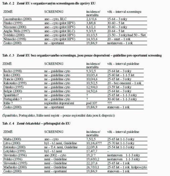 V řadě zemí probíhají pilotní projekty využívající HPV HR testaci u žen po 30 roce jako doplněk cytologie. Na základě dnes nejdelších studií z Holandska je dnes jasné, že u žen po 30 roce a výše spojení cytologie a HPV HR testace minimalizuje riziko falešné negativity a umožní bezpečněji prodloužit screeningový interval. Názory jak ho prodlouží se liší od 3 let ze současného doporučení v USA – FDA povolila v roce 2004 použití HPV HR testace pro primární screening s doporučením paralelní cytologie s následným intervalem při negativitě 3 let. Do této doby byla HPV HR testace schválena pouze pro nálezy hraniční (ASCUS, AGS) a pro sledování po léčbě. Holandská studie považuje za bezpečný až interval 10 let v primárním screeningu při negativitě, což je hraniční doporučení holandských autorů. V tabulce 2,3,4 jsou postupně uvedeny země EU a země čekatelské. V roce 2002 pouze 6 zemí EU (tab. 2) a jedna čekatelská (tab. 4) deklarovaly provádění organizovaného plošného screeningu. Ostatní země mají pouze doporučení (guideline) a screening je oportunní (tab. 3). Nejlepších výsledků dosahuje dnes bezkonkurenčně Lucembursko a Finsko. Finsko má dlouhodobě úspěšný program, který je založen na standardní cytologii. Lucembursko dosáhlo výrazného zlepšení v posledních 10 letech cestou dokonalé kontroly cytologických laboratoří včetně zapojení BLC. Přes úspěchy, které všechny země první skupiny s výjimkou Německa dosáhly, ve všech probíhají pilotní projekty. Ty vyhodnocují zapojení BLC anebo HPV HR testace jako cesty k zlepšení výsledků primárního screeningu (tab. 1). Co je jistě zajímavé, jsou intervaly kontrol v těchto zemích. Minimální interval jsou tři roky v organizovaném screeningu, pouze Německo deklaruje 1 rok. Jak je to možné? Proč má nejhorší výsledky? Při diskuzích na úrovni expertů je jasné, že plošně nelze zajistit u větší kohorty obyvatel kvalitu cytologií a kontrolu screeningového systému v ročním intervalu. Pokud je cytologie odebrána kvalitně (ve většině zemí z této skupiny neodebírají cytologie gynekologové ale vycvičené sestry nebo praktici!!!) a je vyhodnocena v kvalitní laboratoři lze považovat 3 letý interval u normálních nálezů u žen nad 30 let za relativně bezpečný. Není statisticky významný rozdíl mezi
