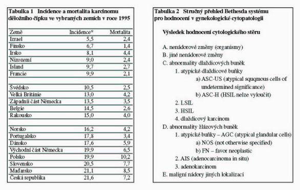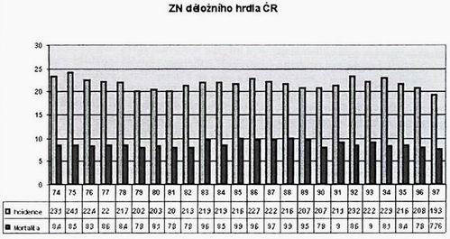 žen a mortalitou 6,9 na 100 000 žen. Incidence onemocnění v ČR je jednou z nejvyšších v Evropě. Průměr incidence zemí EU byl v roce 2000 pouze 9,6 na 100 000 žen. Incidenci a mortalitu karcinomu děložního čípku ve vybraných zemích v roce 1995 zobrazuje tabulka č.1, incidenci a mortalitu karcinomu děložního čípku v České republice v letech 1974 až 1997 zobrazuje graf č.1. Průměrný věk postižených žen je 49 let s maximem prvního vrcholu okolo 35 až 45 let a druhého vrcholu kolem 65-75 let. Vyšší incidence je zaznamenána u sociálně a ekonomicky slabších skupin. Tato vysoká incidence je důsledkem neexistujícího screeningového programu v naší republice. Přehled incidence zhoubných nádorů děložního hrdla v jednotlivých regionech v České republice bude prezentován na přednášce.