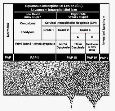Bioptické vyšetření čípku spočívá v posouzení intraepiteliálních změn. K upřesnění nálezu prebioptických metod, pro posouzení závažnosti cervikálních lezí provádíme tzv.malé odběry tkání – punch biopsy pod kolposkopickou kontrolou, scraping biopsy, probatorní excizi nožem, probatorní abrazi cervikálního kanálu kyretou, probatorní excizi elektrokličkou. Nomenklatura histologického hodnocení patologických změn epitelu děložního čípku se postupně vyvíjela přes označování různých stupňů nepravidelností termíny abnormní, atypický, dysplastický epitel.V současnosti je používáno jednotné klasifikace přednádorových změn termínem cervikální intraepiteliální neoplazie-CIN I.až III.stupně. Jedná se o poruchu vyzrávání epitelu s jadernými a buněčnými nepravidelnostmi, ztrátu polarizace doprovázenou zvýšenou mitotickou aktivitou. Při gradingu intraepiteliálních lézí je nejdůležitějším kritériem výška epitelu, který má ještě zachovanou diferenciaci: CIN I v horních 2/3, CIN II v horní 1/2, CIN III již tvoří dysplastický epitel v celém rozsahu. Pokud je používána terminologie cervikální intraepiteliální neoplazie není třeba přesně rozlišovat mezi CIN III a karcinomem in situ. Tabulka č.4 popisuje vzájemnou závislost cytologických a histologických klasifikací patologií děložního čípku. U většiny dysplastických změn zejména typu CIN I dochází ke spontánní regresi nálezu, jedná se tedy o proces reverzibilní. U jiných případů bývá nález nepravidelnosti epitelu dlouhodobě stacionární, pouze u menšího procenta dochází k postupné progresi patologických změn epiteliálního krytu a vyvíjí se invazivní karcinom.Tento proces je dlouhodobý, trvající až 10 let. Protože v současné době nelze spolehlivě určit, které leze budou progredovat, je nutné všechny dysplazie pečlivě sledovat a léčit.