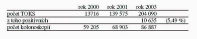 Již hrubá data z let 2000-2003 prokázala jednoznačný nárůst počtu provedených screeningových vyšetření TOKS a tomu odpovídjící nárůst kolonoskopických vyšetření. Výsledky shrnuje následující tabulka: